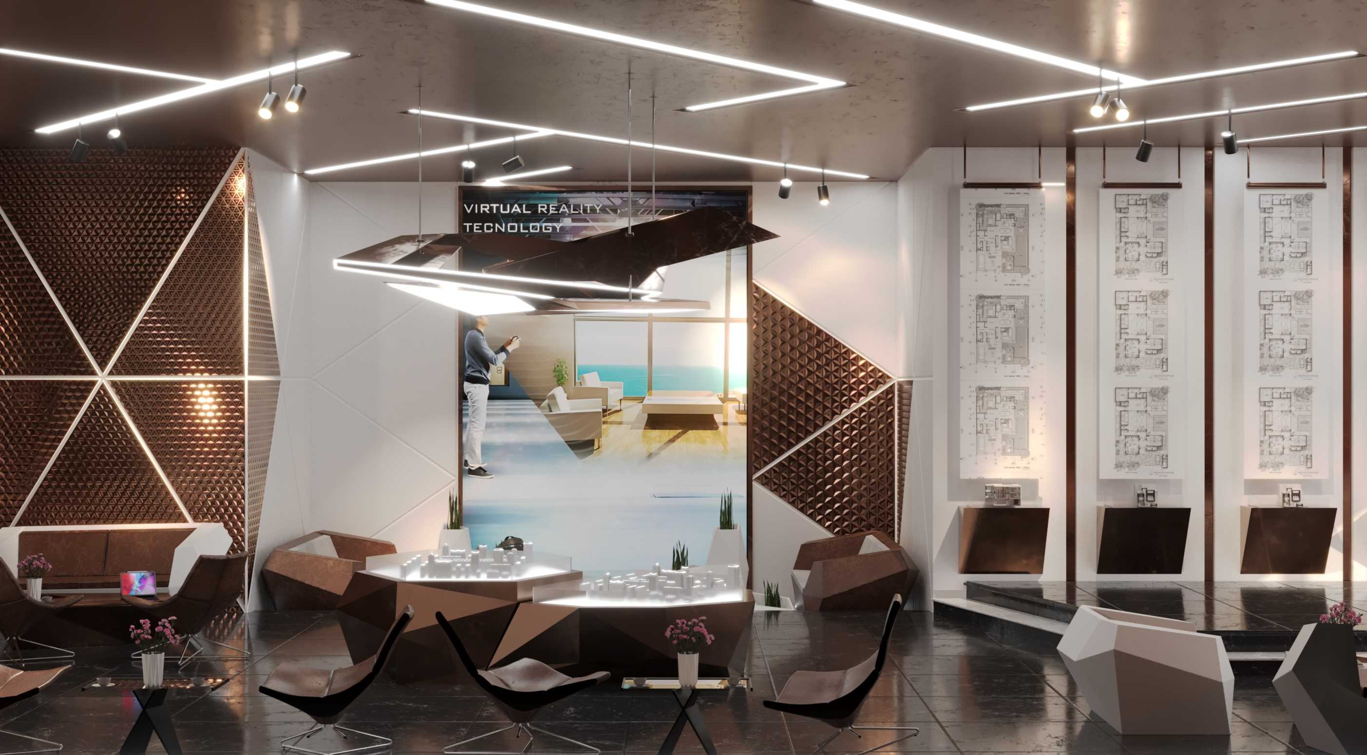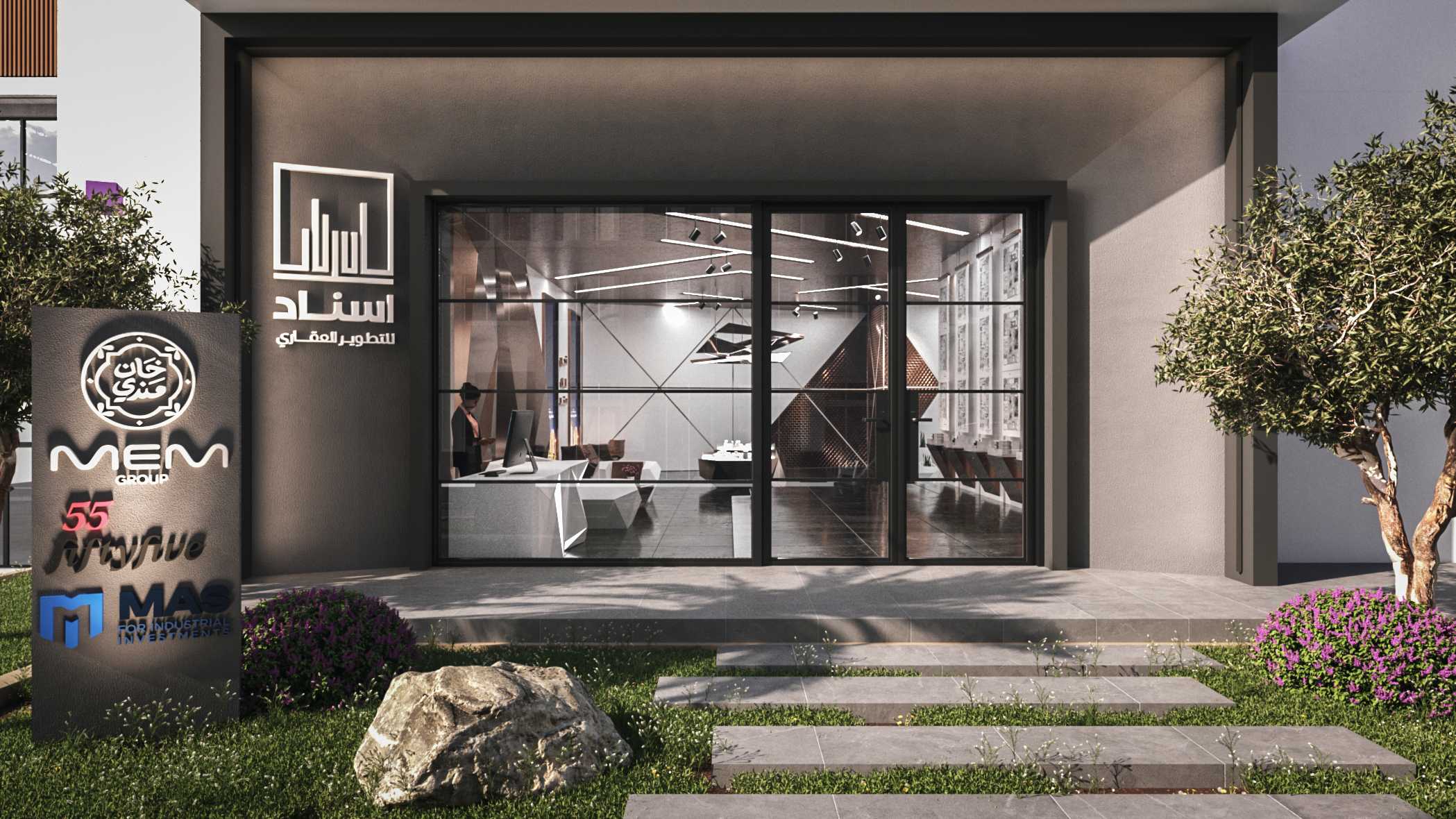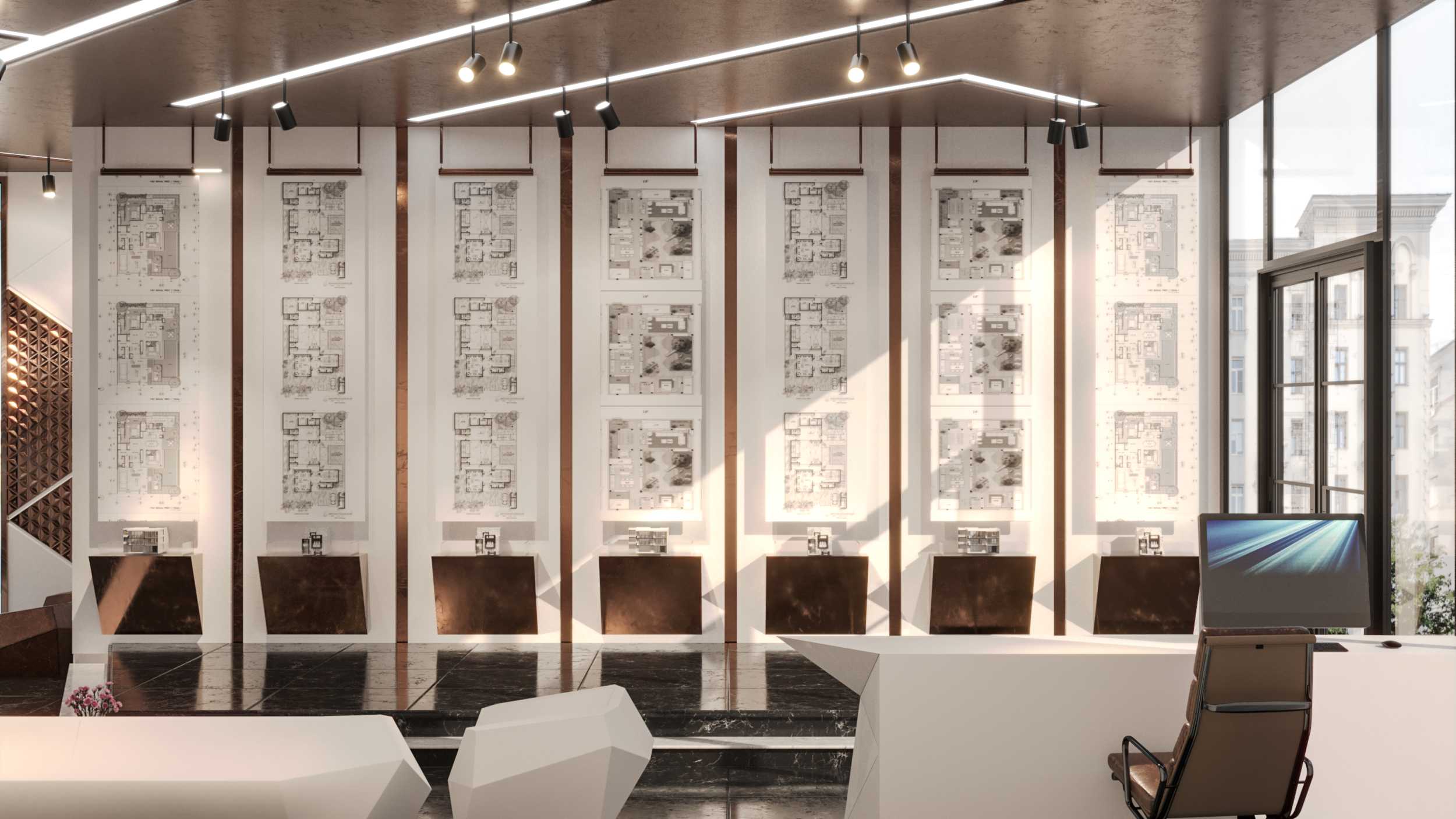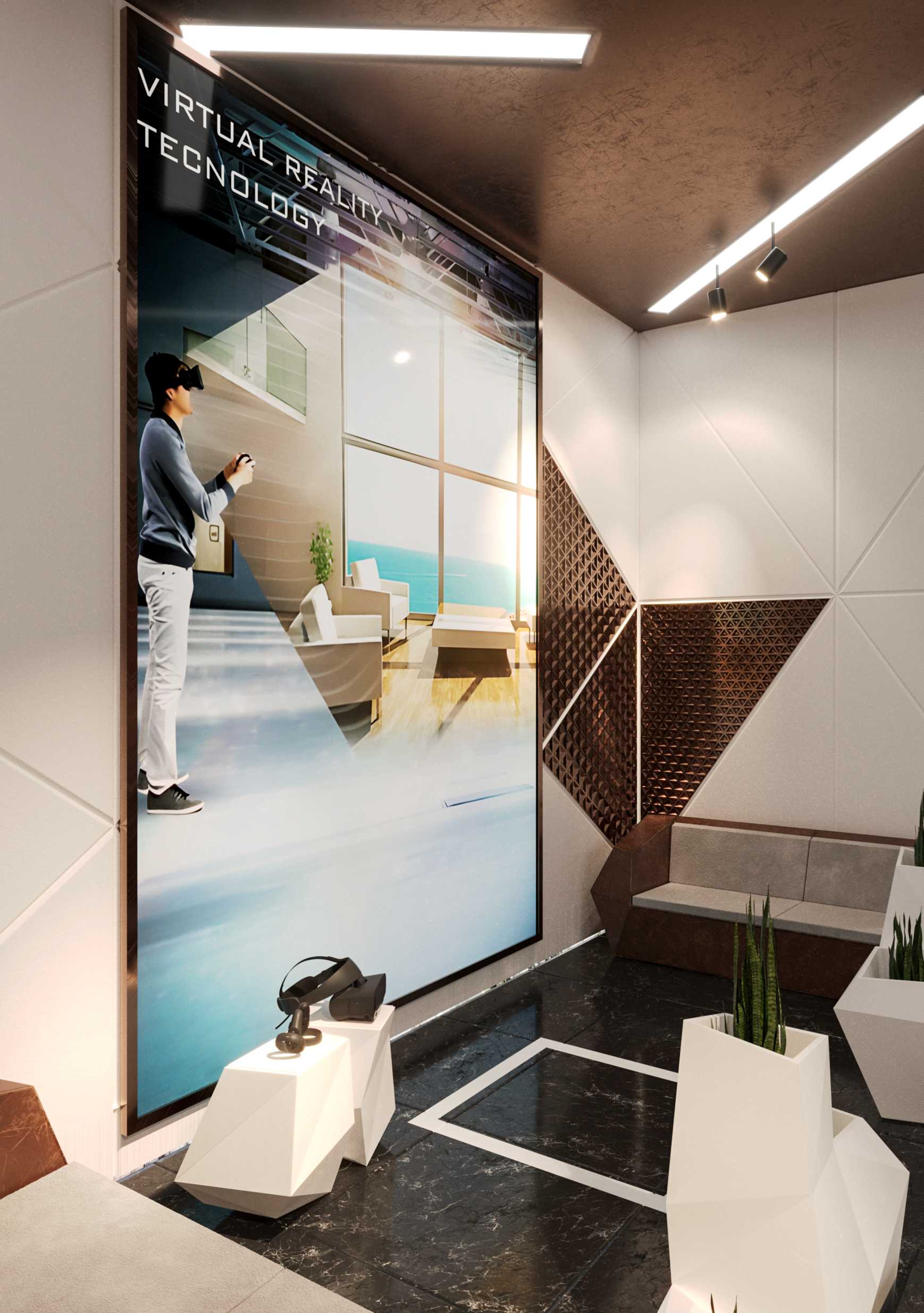 تم تصميم هذا المشروع ليصبح صالة عرض ومبيعات عقارية تعكس التزام العلامة التجارية بـالفخامة، الابتكار، والتطور المعماري. المساحة تدمج بيئة استقبال راقية مع منصات عرض متقدمة لتقديم تجربة عملاء لا تُنسى. تتضمن صالة العرض مكتب استقبال ومساحة استراحة بسيطة بالاضافة الى فضاء الشاشة التفاعلية وفضاء عرض المشاريع يتبنى التصميم مفهوم الهندسة التكعيبية والمستقبلية، حيث يتميز بالخطوط الزاوية الحادة والتكوينات الجريئة. يهدف هذا التوجه إلى خلق مساحة ديناميكية تترك انطباعًا بالقوة والاحترافية.
